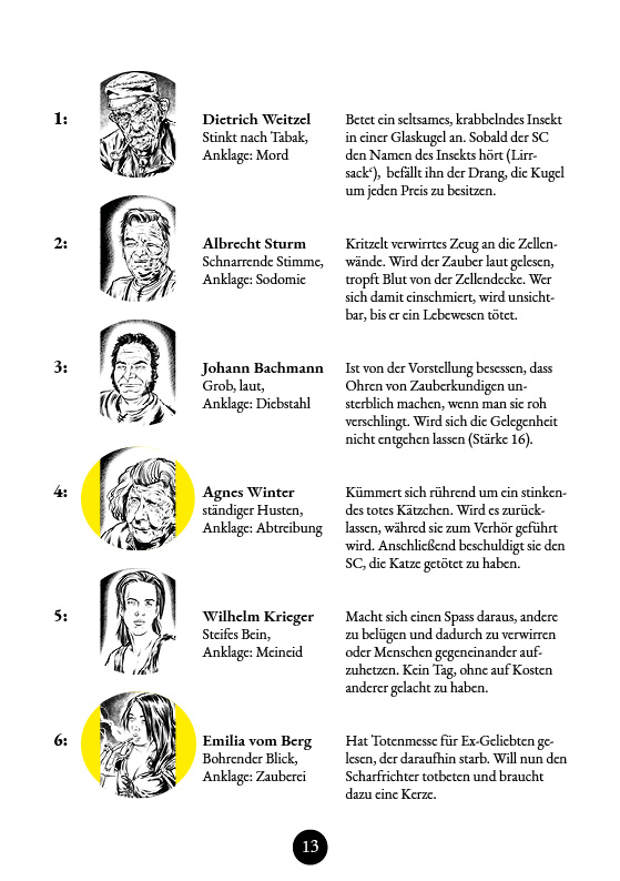 Auch diese Ausgabe ist wieder vollgepackt mit Würfeltabellen, u.a. solche, mit deren Hilfe ihr eurem Spielcharakter vor dem Hintergrund des Dreißigjährigen Krieges mehr Tiefe verleihen könnt.