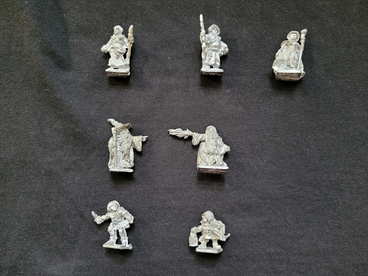 Neu erworbene Miniaturen: Monk (1210), Cleric (1204), Female Magic User (1206), 2 Wizards (1201), Thief (1205), Dwarfen Adventurer (1213) (v.l.n.r.)